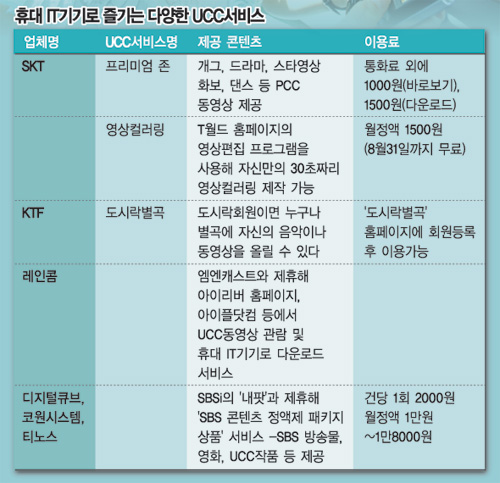 UCC Á¦°ø »ç¾÷ÀÚµé°ú Á¤º¸±â¼ú(IT)±â±â ¾÷üµéÀÇ ¼ºñ½º Á¦ÈÞµµ ´Ã°í ÀÖ´Ù. ÀÌ¿¡ µû¶ó MP3Ç÷¹À̾ ºñ·ÔÇØ ÈÞ´ë¿ë¸ÖƼ¹Ìµð¾îÇ÷¹À̾î(PMP), ÈÞ´ëÆù µîÀ¸·Î UCC¸¦ ÀÚÀ¯·Ó°Ô ´Ù¿î·Îµå ¹Þ¾Æ »ç¿ëÇÒ ¼ö ÀÖ´Ù.