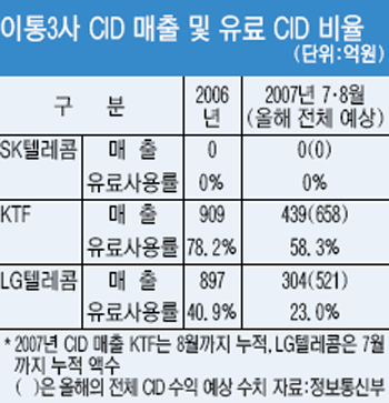 KTF¿Í LGÅÚ·¹ÄÞÀº ÇöÀç CID¸¦ °¢°¢ ¿ù 1000¿ø, 2000¿ø¾¿¿¡ À¯·á Á¦°ø ÁßÀÌ´Ù. ¿ÃÇØ ÀÌµé ¾÷üµéÀÌ CID·Î °ÅµÑ ¼öÀÍÀº °¢°¢ 658¾ï¿ø, 521¾ï¿ø(¿¹»óÄ¡)¿¡ ´ÞÇÑ´Ù. Áö³ÇØ ÀÌµé ¾÷üµéÀÌ ¹ú¾îµéÀÎ CID¼öÀÍÀº ¾÷üº°·Î 909¾ï¿ø, 897¾ï¿ø¿¡ ´ÞÇß´Ù. ¾÷üµé·Î¼± Æ÷±âÇϱ⠾î·Á¿î ¾ËÂ¥ ¼öÀÍ¿øÀÎ ¼ÀÀÌ´Ù.