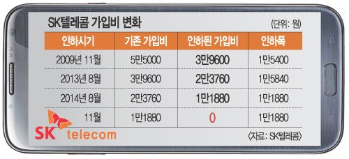 SKÅÚ·¹ÄÞÀº ÇöÀç 1¸¸1880¿øÀÎ ÈÞ´ëÀüÈ­ °¡ÀÔºñ¸¦ 11¿ù 1ÀϺηΠÆóÁöÇÑ´Ù°í 23ÀÏ ¹àÇû´Ù. SKÅÚ·¹ÄÞÀº 1996³â óÀ½ µµÀ﵃ ´ç½Ã 5¸¸5000¿øÀ̾ú´ø °¡ÀÔºñ¸¦ ±×µ¿¾È ´Ü°èÀûÀ¸·Î ÀÎÇÏÇØ ¿Ô´Ù. 2009³â 11¿ù 3¸¸9600¿øÀ¸·Î 1¸¸5400¿ø °¡ÀÔºñ¸¦ ³»¸° µ¥ À̾î Áö³­ÇØ¿Í ¿ÃÇØ 8¿ù °¢°¢ 2¸¸3760¿ø, 1¸¸1880¿øÀ¸·Î °¡ÀÔºñ¸¦ °è¼Ó ÀÎÇÏÇß´Ù.