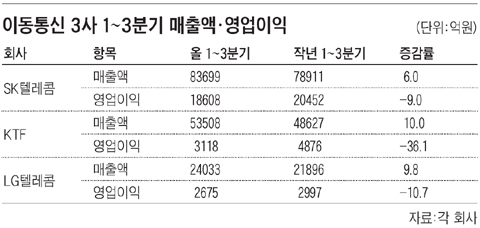 ¹Ý¸é ¿ÃÇØ »ç¾÷ ¼öÀͼºÀ» ³ªÅ¸³»´Â ¿µ¾÷ÀÌÀÍÀº À۳⺸´Ù ¾ÇȵƴÙ. SKÅÚ·¹ÄÞÀº ¿Ã 1~3ºÐ±â ¿µ¾÷ÀÌÀÍÀÌ 1Á¶8608¾ï¿øÀ» ±â·Ï, À۳⠵¿±â(2Á¶452¾ï¿ø)º¸´Ù 9% °¨¼ÒÇß´Ù. KTF´Â 3118¾ï¿øÀ¸·Î À۳⠵¿±â ´ëºñ 36.1% ÁÙ¾ú°í, LGÅÚ·¹ÄÞµµ 10.7% °¨¼ÒÇÑ 2675¾ï¿ø¿¡ ¸Ó¹°·¶´Ù. ¼öÀͼº ¾ÇÈÀÇ °¡Àå Å« ¿øÀÎÀº ¸¶ÄÉÆÃ ºñ¿ë Áõ°¡´Ù. ´ë½ÅÁõ±Ç À̵¿¼· ¾Ö³Î¸®½ºÆ®´Â ¡°SKÅÚ·¹ÄÞ°ú KTF°¡ 3¼¼´ë À̵¿Åë½Å(WCDMA) °¡ÀÔÀÚ È®´ë¸¦ À§ÇØ ¿¬¸»±îÁö ´ë´ëÀûÀÎ ±¤°í¿Í º¸Á¶±Ý °æÀïÀ» À̾°í ÀÖ¾î, ¿ÃÇØ ¿µ¾÷ ÀÌÀÍÀº À۳⺸´Ù 10% ÀÌ»ó °¨¼ÒÇÒ °ÍÀ¸·Î º¸Àδ١±°í ³»´ÙºÃ´Ù.
