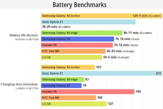 Ÿ»ç ½º¸¶Æ®ÆùÀÇ °æ¿ì ¹èÅ͸® Áö¼Ó½Ã°£Àº ¼Ò´Ï ¿¢½ºÆä¸®¾ÆZ3 9½Ã°£ 29ºÐ, °¶·°½ÃS6¿§Áö 8½Ã°£ 11ºÐ, °¶·°½ÃS6 7½Ã°£ 14ºÐ, È­¿þÀÌP8 7½Ã°£ 12ºÐ, HTC ¿ø M9 6½Ã°£ 25ºÐ, LG G4 6½Ã°£ 6ºÐÀ̾ú´Ù.