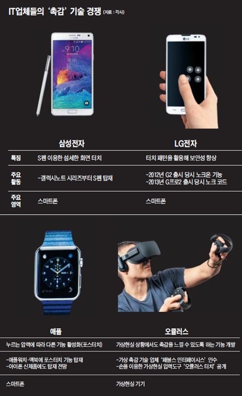 ¾ÆÀÌÆù¿¡µµ ºñ½ÁÇÑ ±â´ÉÀÌ Àû¿ëµÅ È­¸éÀ» ÅåÅå µÎµå¸®¸é Ä«¸Þ¶ó°¡ ÄÑÁø´Ù°Å³ª ±æ°Ô ²Ú ´©¸£¸é ÀüÈ­·Î ¿¬°áµÇ´Â °Í µîÀÌ °¡´ÉÇØÁú Àü¸ÁÀÌ´Ù. ÃÖ±Ù¿¡´Â ½º¸¶Æ®Æù»Ó ¾Æ´Ï¶ó °¡»óÇö½Ç(VR)À̳ª °ÔÀÓ ºÐ¾ß¿¡¼­µµ ÅÍÄ¡ ±â¼ú(Touching tech)ÀÌ »õ·Î¿î °æÀï·ÂÀ¸·Î ÁÖ¸ñ¹Þ°í ÀÖ´Ù. ¾÷üµé¸¶´Ù ÅÍÄ¡ ±â¼úÀ» Áö´Ñ ±â¾÷À» ÀμöÇÕº´(M&A)ÇÏ¸ç ¿ª·®À» Ű¿ö³ª°¡°í ÀÖ´Ù.