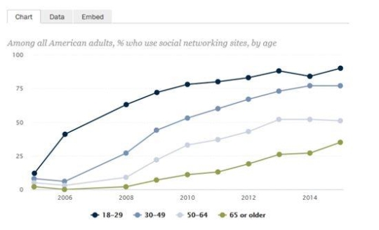 ³ëÀεéÀÇ SNS »ç¿ë Áõ°¡¿Í ´õºÒ¾î ´Ù¸¥ Á¶»ç Ç׸ñµéµµ ´«¿¡ ¶è´Ù. 2015³â ÇöÀç ¹Ì±¹ ³» ¼ºÀεé Áß 65%°¡ SNS ¼­ºñ½º¸¦ ÀÌ¿ë Áß¿¡ ÀÖ´Ù. À̴ óÀ½ Á¶»ç¸¦ ½ÃÀÛÇß´ø 2005³â¿¡ ±â·ÏÇß´ø 7%¿¡ ºñÇØ Å©°Ô Áõ°¡ÇÑ ¼öÄ¡´Ù. °°Àº ±â°£ ÀÎÅÍ³Ý ÀÌ¿ë·üÀº 10%¿¡¼­ 76%·Î Áõ°¡ÇØ ÀÎÅÍ³Ý »ç¿ëÀÚµé Áß »ó´ç¼ö°¡ SNSµµ °°ÀÌ ÀÌ¿ëÇÑ´Ù´Â °ÍÀ» ¾Ë ¼ö ÀÖ¾ú´Ù.
