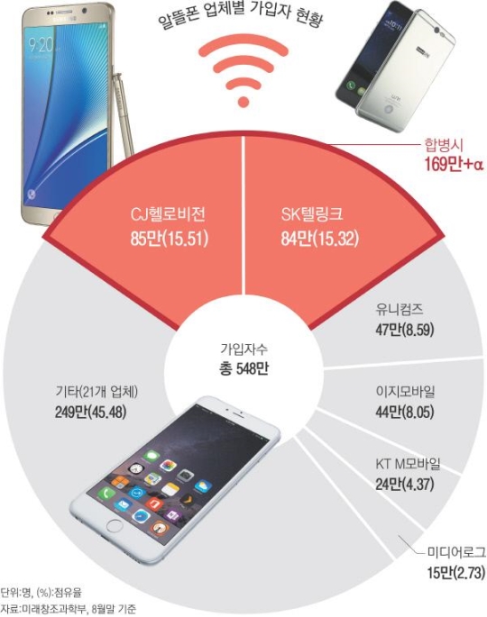 °¡Àå ¹Ý¹ßÀÌ ½ÉÇÑ °÷Àº KT¿Í LGÀ¯Ç÷¯½º´Ù. À̵鵵 ¾Ë¶ãÆù ÀÚȸ»ç¸¦ °Å´À¸®°í ÀÖ´Ù. ¹Ì·¡ºÎ´Â Áö³­ÇØ ÀÌÅë»çµéÀÇ ¾Ë¶ãÆù ½ÃÀå ÁøÃâÀ» Çã¿ëÇϸ鼭 ÀÌÅë»ç ¾Ë¶ãÆù ÀÚȸ»çµéÀÇ ÇÕ»ê Á¡À¯À²ÀÌ Àüü ¾Ë¶ãÆù ½ÃÀåÀÇ 50%¸¦ ³ÑÁö ¸øÇϵµ·Ï Çß´Ù. ÇöÀç 22.42%ÀÎ ÀÌÅë»ç ¾Ë¶ãÆù ÀÚȸ»çµéÀÇ ÇÕ»ê Á¡À¯À²Àº SK¿Í CJ ÇÕº´ ½Ã 37.93%±îÁö Ä¡¼Ú´Â´Ù.