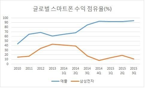 ¾ÖÇÃ(94%)°ú »ï¼ºÀüÀÚ(11%)ÀÇ ¼öÀÍ Á¡À¯À²À» ´õÇϸé 100%°¡ ³Ñ´Â ÀÌÀ¯´Â HTC³ª ºí·¢º£¸®, ¼Ò´Ï, ·¹³ë¹ö µî ´Ù¸¥ ½º¸¶Æ®Æù Á¦Á¶¾÷ü°¡ ÀûÀÚ¸¦ ³Â±â ¶§¹®ÀÌ´Ù. ¿¹¸¦ µé¾î A±â¾÷ÀÌ 9, B±â¾÷ÀÌ 3¸¸ÅÀÇ ÈæÀÚ¸¦ ³»°í C±â¾÷ÀÇ 2¸¸ÅÀÇ ÀûÀÚ¸¦ ³»¸é ¼¼ ±â¾÷ÀÇ ¼öÀÍ ÃÑÇÕÀº 10ÀÌ µÇ°í, ±× Áß A¿Í BÀÇ Á¡À¯À²À» ÇÕÇϸé 120%°¡ µÇ´Â ÀÌÄ¡´Ù.