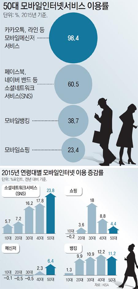 20, 30´ëÀÇ ÀüÀ¯¹°·Î ¿©°ÜÁ³´ø ¸ð¹ÙÀÏ ÀÎÅͳݼºñ½º¿¡ 50´ë°¡ ÀûÀÀÀ» ³¡³Â´Ù.
