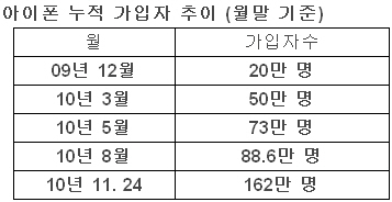 Ãâ½Ã 4°³¿ù¸¸¿¡ °¡ÀÔÀÚ 50¸¸¸íÀ» µ¹ÆÄÇß°í, 9°³¿ù¸¸¿¡ °¡ÀÔÀÚ 100¸¸¸íÀ» ³Ñ¾î¼± ¾ÆÀÌÆùÀº 11¿ù ÇöÀç 162¸¸¸íÀÌ °¡ÀÔÇßÀ¸¸ç Ãâ½Ã ÀÌÈÄ ÇÏ·ç Æò±Õ 4õ¸í ÀÌ»óÀÌ °¡ÀÔÇß´Ù.