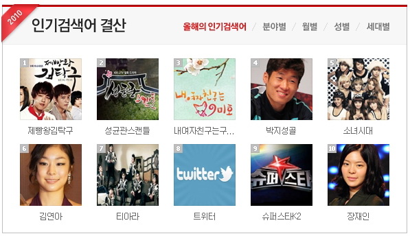 Æ÷ÅлçÀÌÆ® ³×À̹ö°¡ 6ÀÏ ¹ßÇ¥ÇÑ ¡®2010 Àαâ°Ë»ö¾î£§¿¡ µû¸£¸é 1~3À§¸¦ µå¶ó¸¶°¡ Â÷ÁöÇÑ °ÍÀ¸·Î ³ªÅ¸³µ´Ù.
