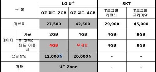 SKTÀÇ T·Î±×ÀÎ ¿ä±ÝÁ¦¿¡¼­ º¸Á¶±Ý À̿ܿ¡ Ãß°¡ÀûÀÎ ¿ä±ÝÇÒÀÎÀ» ¹ÞÀ» ¼ö ¾ø´Â °Í°ú ´Þ¸®, LGÀ¯Ç÷¯½º´Â OZ ÆÐµå ¿ä±ÝÁ¦¿¡µµ ¿ä±ÝÇÒÀÎÀ» Àû¿ëÇß´Ù.