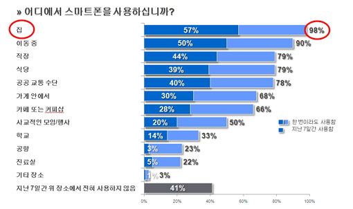 ±¸±ÛÀº 7ÀÏ ±Û·Î¹ú ¸¶ÄÏ ¸®¼­Ä¡ ȸ»ç ÀÔ¼Ò½º(Ipsos)¿¡ ÀÇ·ÚÇØ Àü±¹ 1000¸íÀÇ ½º¸¶Æ®Æù »ç¿ëÀÚ¸¦ ´ë»óÀ¸·Î ÁøÇàÇÑ ¼³¹®Á¶»ç(º¹¼öÀÀ´ä °¡´É)¿¡¼­ ¡®½º¸¶Æ®ÆùÀ» ¾îµð¿¡¼­ »ç¿ëÇϽʴϱ¶ó´Â Áú¹®¿¡ ¡®Áý(98%)¡¯ÀÌ ¡®À̵¿ Áß(90%)¡¯º¸´Ù ´õ ¸¹ÀÌ ²ÅÈ÷¸ç °¡Àå ÁÖµÈ ½º¸¶Æ®Æù »ç¿ë Àå¼Ò·Î ³ªÅ¸³µ´Ù°í ¹àÇû´Ù.
