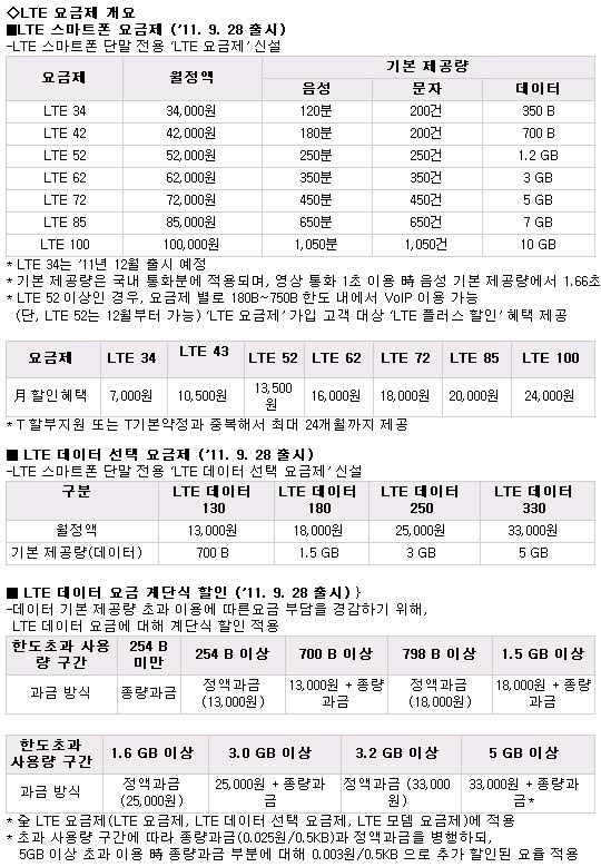 Á¤¾×Á¦´Â ¡ãLTE 34(12¿ù ¿¹Á¤) ¿ù 3¸¸4000¿ø ¡ãLTE 42 ¿ù 4¸¸2000¿ø ¡ãLTE 52 ¿ù5¸¸2000¿ø ¡ãLTE 62 ¿ù 6¸¸2000¿ø ¡ãLTE 72 ¿ù 7¸¸2000¿ø ¡ãLTE 85 ¿ù 8¸¸5000¿ø ¡ãLTE 100 ¿ù 10¸¸¿ø µî 7Á¾ÀÌ´Ù. ¸ð¹ÙÀÏÀÎÅͳÝÀüÈ­(mVoIP)´Â LTE 52 ÀÌ»ó ¿ä±ÝÁ¦ »ç¿ëÀÚ°¡ Á¦ÇÑÀûÀ¸·Î ÀÌ¿ëÇÒ ¼ö ÀÖ´Ù.