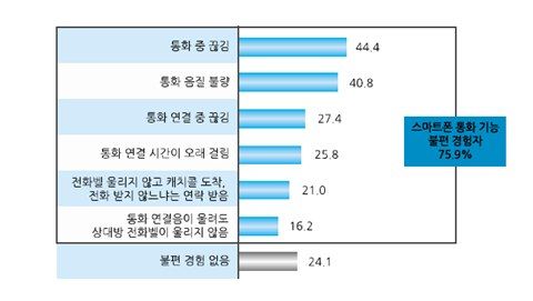 ½º¸¶Æ®Æù ÀÌ¿ëÀÚÀÇ 75.9%´Â ÅëÈ­ ±â´É ÀÌ¿ë ½Ã ºÒÆíÀ» ´À³¤ °æÇèÀÌ ÀÖ´Â °ÍÀ¸·Î ³ªÅ¸³µÀ¸¸ç, ÀÌÁß ¡®ÅëÈ­ Áß ²÷±è(44.4%)¡¯ Çö»óÀ» °¡Àå ¸¹ÀÌ ²Å¾Ò´Ù.