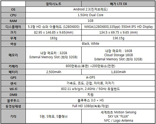 µÎ Á¦Ç°Àº ÃÖ±Ù LTE ½º¸¶Æ®Æù¿¡ °øÅëÀûÀ¸·Î žÀçµÇ´Â Ä÷ÄÄ ½º³Àµå·¡°ï 1.5Ghz µà¾óÄÚ¾î ÇÁ·Î¼¼½º, ¾Èµå·ÎÀ̵å 2.3 ÁøÀúºê·¹µå, Èĸé 800¸¸ È¼Ò ¹× Àü¸é 200¸¸ ȼÒÀÇ Ä«¸Þ¶ó µî °ÅÀÇ °øÅëµÈ ½ºÆåÀ» °¡Áö°í ÀÖ´Ù. ¹Ý¸é µð½ºÇ÷¹ÀÌ, Å©±â ¹× ¹«°Ô, ³»Àå ¸Þ¸ð¸®, º£Å͸® ¿ë·®¿¡¼ Â÷À̸¦ º¸¿´´Ù.