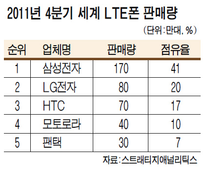 »ï¼ºÀüÀÚ´Â Áö³­ 4ºÐ±â 170¸¸´ëÀÇ LTEÆùÀ» ÆÇ¸ÅÇØ 41%ÀÇ Á¡À¯À²À» ±â·ÏÇϸç 2ºÐ±â ¿¬¼Ó 1À§¸¦ Â÷ÁöÇß´Ù. LGÀüÀÚ´Â 80¸¸´ë¸¦ ÆÇ¸ÅÇϸç Á¡À¯À² 20%¸¦ ±â·Ï, 70¸¸´ë¸¦ ÆÈ¾Æ Á¡À¯À² 17%¸¦ ±â·ÏÇÑ HTC¸¦ µûµ¹¸®°í 2À§¿¡ ¿Ã¶ú´Ù. ÀÌ´Â LGÀüÀÚ°¡ 3G ½º¸¶Æ®Æù ½ÃÀå Ãʱ⠰íÀüÀ» ¸éÄ¡ ¸øÇÏ´ø »óȲ¿¡¼­ ¹þ¾î³ª LTE Ãʱ⠽ÃÀå¿¡ ¼º°øÀûÀ¸·Î ¾ÈÂøÇϰí ÀÖÀ½À» º¸¿©Áشٴ Æò°¡´Ù.