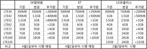 SKÅÚ·¹ÄÞÀº 3¿ù28ÀÏ LTE ¿ä±ÝÁ¦ÀÇ µ¥ÀÌÅÍ Á¦°ø·® È®´ë¿Í µ¥ÀÌÅÍ Ãʰú¿ä±Ý »óÇÑÁ¦ µµÀÔÀ» °ñÀÚ·Î ÇÏ´Â LTE ¿ä±Ýü°è °³Æí¾ÈÀ» ¹ßÇ¥Çß´Ù. À̾ KTµµ µ¥ÀÌÅÍ ±âº» Á¦°ø·®À» ÃÖ´ë 2¹è±îÁö È®´ëÇϰڴٰí 3¿ù29ÀÏ ¹àÇû´Ù. KTÀÇ µ¥ÀÌÅÍ Á¦°ø·®Àº SKÅÚ·¹ÄÞº¸´Ù ´Ù¼Ò ¸¹°í LGÀ¯Ç÷¯½º¿Í µ¿ÀÏÇÑ ¼öÁØÀÌ´Ù. Åë½Å3»çÀÇ LTE µ¥ÀÌÅÍ Á¦°ø·®À» Á¤¸®ÇÏ¸é ¾Æ·¡¿Í °°´Ù.