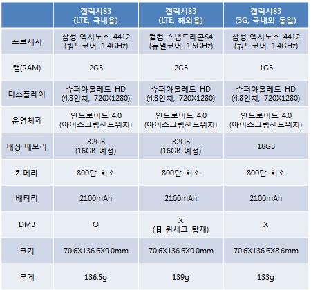 ±¹³»¿¡¼­ °¶·°½ÃS3´Â 3G ¸ðµ¨°ú LTE ¸ðµ¨·Î °¢°¢ Ãâ½ÃµÈ´Ù. ±¹³»¿ë LTE ¸ðµ¨ÀÇ °æ¿ì, µà¾óÄÚ¾î 1.5GHz ½º³Àµå·¡°ïS4(MSM8960)°ú 2GB ·¥À» žÀçÇÑ ÇØ¿Ü ¸ðµ¨°ú ´Þ¸®, 1.4GHz ¿¢½Ã³ë½º Äõµå¿Í 2GB ·¥À» žÀçÇÑ´Ù. ¶ÇÇÑ Áö»óÆÄ DMB¸¦ žÀçÇØ ±¹³» »ç¿ëÀÚ È¯°æÀ» °í·ÁÇß´Ù. ´ë½Å µÎ²² 9mm, ¹«°Ô 136.5gÀ¸·Î 3G ¸ðµ¨(8.6mm, 133g)º¸´Ù ´Ù¼Ò Ä¿Áö°í ¹«°Å¿öÁ³´Ù.