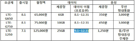 »õ·Î ³»³õÀº LTE ¿ä±ÝÁ¦ ¶ÇÇÑ ÆÄ°ÝÀûÀÌ´Ù. 9¿ù1ÀϺÎÅÍ Ãâ½ÃÇÏ´Â `LTE-1250`¿ä±ÝÁ¦´Â ¿ù 12¸¸5000¿øÀ» ³»¸é 25GBÀÇ µ¥ÀÌÅÍ¿Í 1250ºÐÀÇ À½¼ºÅëÈ­, KT¸Á³» ¹«Á¦ÇÑ À½¼ºÅëÈ­¸¦ Á¦°øÇÑ´Ù. µ¥ÀÌÅÍ´Â °íÇØ»óµµ ¿µÈ­ 20¿©ÆíÀ» º¼ ¼ö ÀÖ´Â ºÐ·®ÀÌ´Ù. ¶ÇÇÑ 8¿ù¿¡´Â ¸Á³»ÅëÈ­ 3000ºÐÀ» Á¦°øÇÏ´Â »õ·Î¿î ¿ä±ÝÁ¦¸¦ Ãß°¡·Î ³»³õÀ» ¿¹Á¤ÀÌ´Ù.