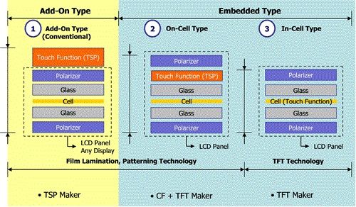 ÀÌ·¯ÇÑ ±â¼úÀ» ÅëÆ²¾î ÀÏÄ´ ºÎÂøÇü(Add-On) ¹æ½ÄÀ» ³Ñ¾î ÃÖ±Ù¿¡´Â ÅÍÄ¡ ±â´ÉÀ» µð½ºÇ÷¹ÀÌ ¾È¿¡ Æ÷ÇÔÇÏ´Â ³»ÀåÇü ±â¼úÀÌ ÁÖ¸ñ¹Þ°í ÀÖ´Ù. ³»ÀåÇü ÅÍÄ¡ ±â¼úÀº Àμ¿(In-cell)°ú ¿Â¼¿(On-cell)·Î ´Ù½Ã ±¸ºÐµÈ´Ù. ¸» ±×´ë·Î ¿Â¼¿Àº µð½ºÇ÷¹ÀÌ À§¿¡ ITO¸¦ ¹Ú¸· ÁõÂø½ÃŰ´Â ¹æ½ÄÀ̰í Àμ¿Àº µð½ºÇ÷¹ÀÌ ³»ºÎ¿¡ ITO¸¦ ¹Ú¸· ÁõÂøÇÏ´Â ¹æ½ÄÀÌ´Ù.