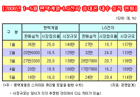 ÆÒÅð述ú LGÀüÀÚ°¡ ¿Ã »ó¹Ý±â ÈÞ´ëÆù ³»¼ö½ÃÀå¿¡¼ ³ªÅ¸³½ Á¡À¯À²À» »ìÆìº¸¸é, ÆÒÅðè¿Àº 1, 4¿ù¿¡, LGÀüÀÚ´Â 2, 5¿ù¿¡ °¢°¢ »ó´ëÀûÀ¸·Î ¿ìÀ§¸¦ ³ªÅ¸³ÂÀ¸¸ç 3¿ùÀº ¾ùºñ½ÁÇÑ ¾ç»óÀ» º¸¿´´Ù.