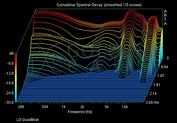 ÀÌ·± Ư¡Àº Á֯ļö ÀÀ´äƯ¼º(Cumulative Spectral decay, CSD) ÃøÁ¤¿¡¼µµ Àß ³ªÅ¸³´Ù. Á֯ļö ÀÀ´äƯ¼ºÀ̶õ ½ºÇÇÄ¿³ª À̾îÆùÀÌ Ãâ·ÂÇÏ´Â ¼Ò¸®°¡ Àΰ£ÀÇ °¡Ã» ´ë¿ª Á֯ļöÀÎ 20Hz~22KHz ¹üÀ§ ³»¿¡¼ ¾ó¸¶¸¸ÅÀÇ À½·®À¸·Î Ãâ·ÂµÇ´ÂÁö¸¦ ÃøÁ¤ÇÑ °ªÀ» ¸»ÇÑ´Ù. ÃøÁ¤¿¡´Â À½Çâ±â±â Àü¹® »çÀÌÆ®ÀÎ £§°ñµçÀ̾£§ÀÇ Àåºñ¸¦ ÀÌ¿ëÇß´Ù.