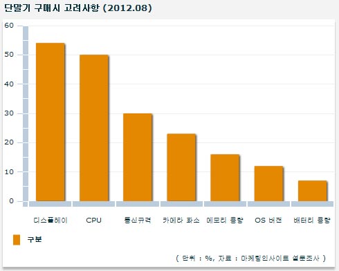 ÇÏÁö¸¸ °á°ú¸¦ ÀÚ¼¼È÷ µé¿©´Ùº¸¸é Àç¹ÌÀÖ´Â »ç½ÇÀ» ¹ß°ßÇÒ ¼ö ÀÖ´Ù. ¡®¹«¾ùÀ» ¼º´É/½ºÆåÀÇ ±âÁØÀ¸·Î »ï¾Ò´Â°¡¡¯¶ó´Â Áú¹®(º¹¼öÀÀ´ä ±âÁØ)¿¡ 54%¿¡ À̸£´Â »ç¶÷ÀÌ ¡®µð½ºÇ÷¹ÀÌ/¾×Á¤ ÇØ»óµµ¡¯¶ó°í ´äÇÑ °Í. ¡®CPU(¾ÖÇø®ÄÉÀÌ¼Ç ÇÁ·Î¼¼¼)¡¯¸¦ ²ÅÀº »ç¶÷Àº 50%·Î 4% ³·¾Ò´Ù. °á±¹ ¼ÒºñÀÚ´Â ÇØ»óµµ°¡ ³ôÀº ȸéÀ» ¾´ ´ëÇü ½º¸¶Æ®ÆùÀϼö·Ï ¼º´ÉÀÌ ¶Ù¾î³¯ °ÍÀ̶ó°í ±â´ëÇÑ´Ù´Â °É ¾Ë ¼ö ÀÖ´Ù.