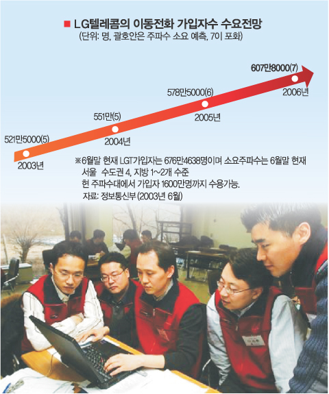 ¡ßÁ¤Ã¥ µû·Î ½ÃÀå µû·Î=Á¤ºÎÀÇ 3¼¼´ë À̵¿Åë½ÅÁ¤Ã¥ÀÌ ½ÃÀåÀ̳ª ±â¼ú¹ßÀüÃß¼¼¿Í µû·Î ³î¾Ò´Ù´Â ºñÆÇÀ» ¸éŰ Èûµé´Ù. ¾Õ¼ Á¤ÅëºÎ´Â 2003³â 6¿ù LGT¿¡°Ô 2§×´ë¿ªÀÇ µ¿±â½Ä IMT¼ºñ½º¸¦ 2006³â 6¿ù ¸»±îÁö ´ÊÃçÁá´Ù. Á¤ºÎ´Â À̶§ ±âÁ¸ 1.8§×´ë¿ªÀÇ Á֯ļö°¡ Æ÷È»óÅ¿¡ À̸¦ °ÍÀ¸·Î ³«°üÇß´Ù. ÀÌ ¿¹Ãø¿¡ µû¸£¸é LGTÀÇ °¡ÀÔÀÚ´Â 2006³â ¸» 607¸¸8000¸í¿¡ À̸£°í Á֯ļöµµ Æ÷È»óÅÂÀÎ 7°³¿¡ À̸¦ °ÍÀ¸·Î ¿¹»óµÆ´Ù. ±×·¯³ª ÇöÀç LGTÀÇ °¡ÀÔÀÚ°¡ 6¿ù ¸» ÇöÀç 676¸¸4638¸íÀ¸·Î ¿¹ÃøÄ¡¸¦ Èǽ ³Ñ¾î¼¹Áö¸¸ Á֯ļö´Â ¼¿ï °æ±â±Ç 4°³(Áö¹æÀº 1¡2°³)·Î ³²¾Æµ¹°í ÀÖ´Ù. ƯÈ÷ 2¼¼´ëÀÇ ÁøÈµÈ ±â¼úÀÎ ¡®¸®ºñÀü A¡¯±îÁö »ó¿ë鵃 °æ¿ì ±âÁ¸ Á֯ļö¿¡¼µµ ¹«·Á 1600¸¸¸í±îÁö ¼ö¿ëÇÒ ¼ö ÀÖ´Ù´Â °Ô LGTÀÇ ¼³¸íÀÌ´Ù. Á¤ºÎÀÇ Á֯ļö ¿¹ÃøÀÌ ÇÑÂü ºø³ª°¬´ø ¼ÀÀÌ´Ù.