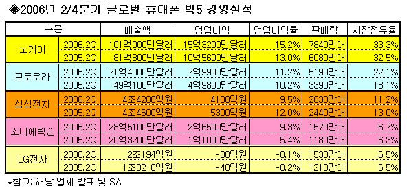 2006³â »ó¹Ý±â Çѱ¹ ÈÞ´ëÆù ¾÷üµéÀº ÇØ¿Ü½ÃÀå¿¡¼ ³ëŰ¾Æ, ¸ðÅä·Î¶ó, ¼Ò´Ï¿¡¸¯½¼ µîÀÇ °Å¼¾ °ø¼¼¿¡ ¹Ð·Á ºÎÁøÀ» ¸éÄ¡¸øÇß´Ù.