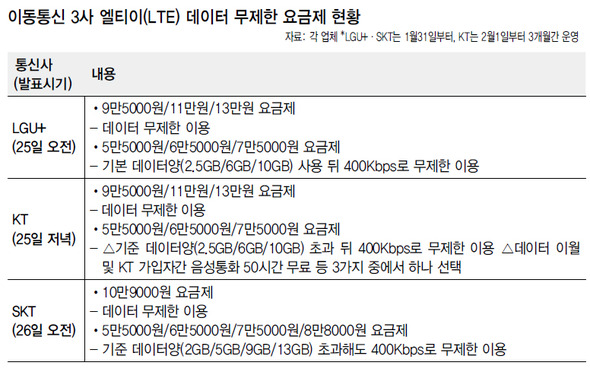 À̵¿Åë½Å 3»ç°¡ ÀÏÁ¦È÷ µ¥ÀÌÅÍ ¹«Á¦ÇÑ ¿¤Æ¼ÀÌ(LTE) ¿ä±ÝÁ¦¸¦ ³»³õ°í ¸¶ÄÉÆÃ °æÀï¿¡ ³ª¼¹´Ù. ÀÏ´Ü ÀÌ¿ëÀÚµéÀÇ ¼±ÅÃÀÇ ÆøÀÌ ³Ð¾îÁø´Ù´Â Á¡¿¡¼­ ±àÁ¤ÀûÀÌÁö¸¸, µ¥ÀÌÅÍ Æ®·¡ÇÈ ±ÞÁõ°ú ¡®°í°¡ ½º¸¶Æ®Æù °øÂ¥¡¯ ÇüÅÂÀÇ ´«°¡¸²½Ä ¸¶ÄÉÆÃ¿¡ µû¸¥ ¼ÒºñÀÚ Åë½Åºñ ºÎ´ã Áõ°¡ µî ¿ì·ÁÀÇ ¸ñ¼Ò¸®µµ ³ª¿Â´Ù.