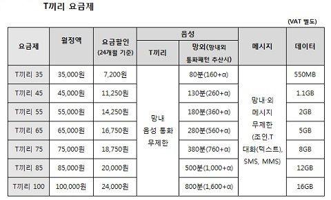 ¡®T³¢¸® ¿ä±ÝÁ¦¡¯´Â 35, 45, 55, 65, 75, 85, 100 µî 7Á¾ÀÌ´Ù. ÀÌ ¿ä±ÝÁ¦¿¡ °¡ÀÔÇÏ´Â SKÅÚ·¹ÄÞ °í°´Àº ÀÚ»ç °¡ÀÔÀÚ°£ À½¼º ÅëȻӸ¸ ¾Æ´Ï¶ó Ÿ»ç °í°´°úµµ SMS(°Ç´ç 20¿ø)¿Í MMS(°Ç´ç 100¿ø), Á¶ÀÎ(äÆÃ)À» ¹«Á¦ÇÑ ÀÌ¿ëÇÒ ¼ö ÀÖ´Ù. ¡®T³¢¸® ¿ä±ÝÁ¦¡¯ °¡ÀÔÀº LTE»Ó¸¸ ¾Æ´Ï¶ó 3G °í°´µµ °¡´ÉÇÏ´Ù.