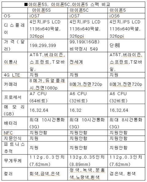 ¾ÖÇÃÀÌ 10ÀÏ(ÇöÁö½Ã°£) ¹Ì ÄíÆÛƼ³ë º»»ç¿¡¼­ ¹ßÇ¥ÇÑ ½ÃÁ¡¿¡¼­ÀÇ ¾ÆÀÌÆù5S,¾ÆÀÌÆù5C,¾ÆÀÌÆù5ÀÇ ½ºÆåÀ» Ç¥·Î ¿ä¾à ºñ±³ÇØ ºÃ´Ù.
