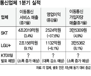 29ÀÏ Åë½Å¾÷üµéÀÇ Áö³­ 1ºÐ±â ½ÇÀûÀ» º¸¸é, ¿¤ÁöÀ¯Ç÷¯½º(LGU+)ÀÇ °¡ÀÔÀÚ´ç ¸ÅÃâ(¾Æ¸£ÇÁ)Àº 3¸¸5362¿øÀ¸·Î Áö³­ÇØ °°Àº ±â°£¿¡ °ßÁà 8.4% ´Ã¾ú´Ù. ¿¡½ºÄÉÀÌÅÚ·¹ÄÞ(SKT)ÀÇ °¡ÀÔÀÚ´ç ¸ÅÃâÀº 3¸¸5309¿øÀ¸·Î 4.9% Áõ°¡Çß´Ù. ÄÉÀÌÆ¼(KT) ¾Æ¸£ÇÁµµ ¼ÒÆø Áõ°¡ÇÑ °ÍÀ¸·Î ¾Ë·ÁÁ³´Ù. °¡ÀÔÀÚ´ç ¸ÅÃâÀ̶õ °¡ÀÔÀÚ°¡ ½ÇÁ¦·Î ºÎ´ãÇÑ À½¼ºÅëÈ­¡¤¹®ÀÚ¸Þ½ÃÁö¡¤µ¥ÀÌÅÍÅë½Å ¿ä±ÝÀ» ¸»ÇÑ´Ù. °¡ÀÔÀÚµéÀÇ À̵¿Åë½Å ÀÌ¿ë·á ºÎ´ãÀÌ Áö³­ 1³â »çÀÌ ±×¸¸Å­ Áõ°¡ÇÑ °ÍÀÌ´Ù.