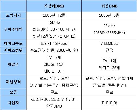 ¢Ñ Áö»óÆÄDMB¿Í À§¼ºDMB ºñ±³Ç¥