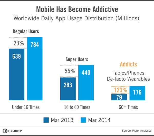 ¹Ì±¹ ¸ð¹ÙÀÏ ºÐ¼® ¾÷ü ¡®Ç÷¯¸®(Flurry)¡¯°¡ 22ÀÏ ¸ð¹ÙÀÏ Áßµ¶ º¸°í¼­¸¦ ³»³ù½À´Ï´Ù. Á¦¸ñÀº ¡®¸ð¹ÙÀÏ Áßµ¶ÀÇ µîÀå (The Rise of the Mobile Addict)¡¯. »ç¶÷µéÀº ÇÏ·ç 10¹øÂë ¸ð¹ÙÀÏ ¾Û(ÀÀ¿ë ÇÁ·Î±×·¥)À» ½ÇÇàÇÑ´Ù°í ÇÕ´Ï´Ù. Ç÷¯¸®´Â ÇÏ·ç 60¹ø ÀÌ»ó, ±×·¯´Ï±î Æò±ÕÀÇ 6¹è ÀÌ»ó ¾ÛÀ» ½ÇÇàÇÏ´Â °ÍÀ» ¡®¸ð¹ÙÀÏ Áßµ¶£§À̶ó°í Á¤ÀÇÇß½À´Ï´Ù.