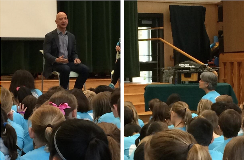Q&A from the kids for £¢Mister Bezos£¢: £¢How does that even work?£¢ (Pointing at the drone)