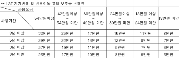 ¹øÈ£À̵¿À¸·Î ±¸ÀÔÇϽô °æ¿ì ±âÁ¸ Åë½Å»ç(SKT/KTF/KT)¿¡¼ ¹ßÇà¹ÞÀº ÀÌ¿ë°è¾àÁõ¸í¼¿¡ ÀÖ´Â »ç¿ë±â°£°ú »ç¿ë±Ý¾×À» ¾Æ·¡ LGT º¸Á¶±Ý Å×ÀÌºí¿¡ ´ëÀÔÇßÀ»¶§ ÇØ´çÇÏ´Â º¸Á¶±ÝÀ» Áö±Þ¹ÞÀ¸½Ã´Â °Ì´Ï´Ù. ±âÁ¸ Åë½Å»ç¿¡¼ ¹ßÇàÇÑ ÀÌ¿ë°è¾àÁõ¸í¼»óÀÇ ±Ý¾×´ë·Î Àû¿ëµÇ´Â°Ô ¾Æ´Õ´Ï´Ù.