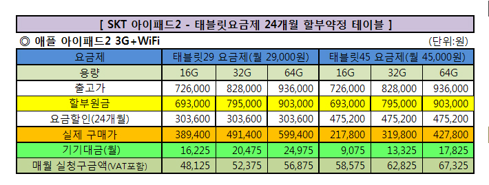 SKT ¾ÆÀÌÆÐµå2 - ÅÂºí¸´ 24°³¿ù ÇҺξàÁ¤ ¿ä±ÝÁ¦º° ÆÇ¸Å°¡°ÝÇ¥ÀÔ´Ï´Ù. (* SKT´Â ÇҺα¸¸Å½Ã À¯ÀÌÀÚ Á¤Ã¥À¸·Î 5.9%ÀÇ ÇÒºÎÀÌÀÚ ºÎ°¡µÊ)